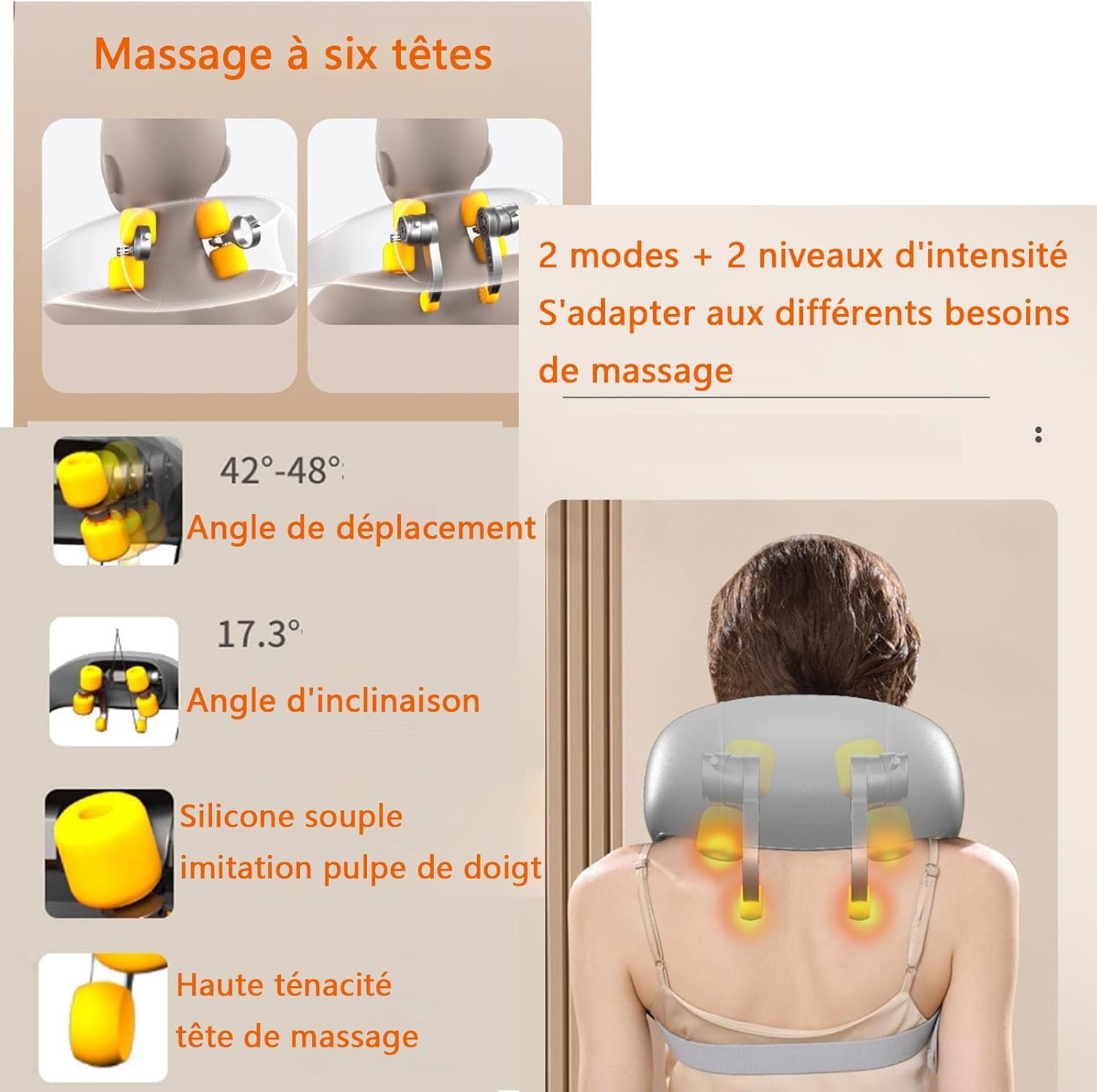 The neck massager includes a heat option with two adjustable heat compress settings (104°F/111°F) to enhance relaxation and alleviate tension. It automatically shuts off after 10 minutes to prevent overheating, ensuring safe and comfortable use, even if you fall asleep during the massage.