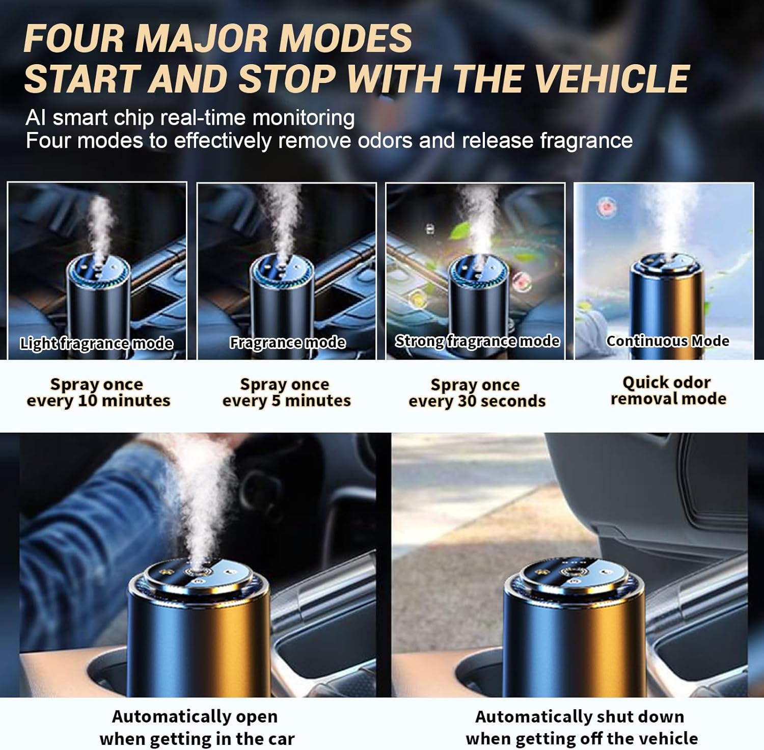 Equipped with an AI smart chip, this diffuser automatically turns on or off based on your car’s environment. With three adjustable modes—light, strong, and continuous—you can customize the fragrance intensity to your liking.
